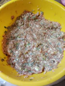 ひき肉を調味料と混ぜて、脱水したキャベツとニラ、ねぎを入れて混ぜる ※息子が